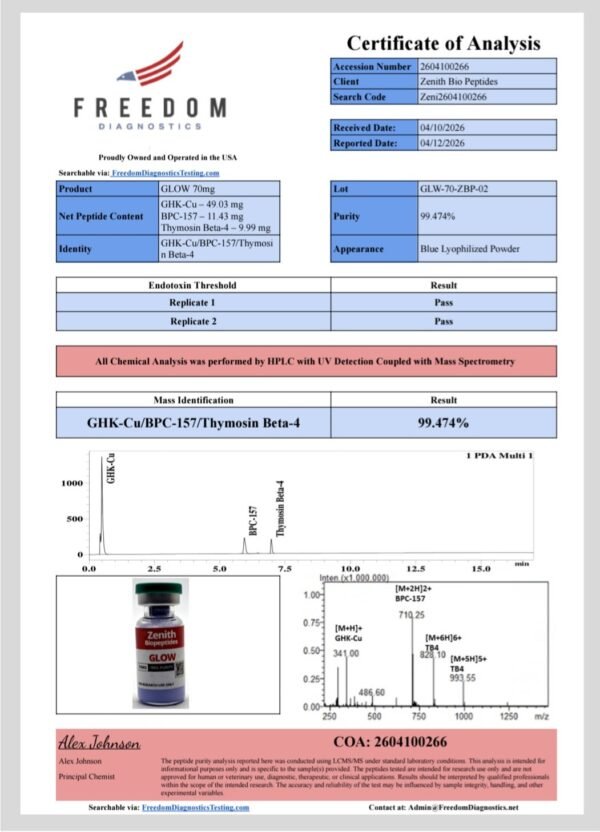 Glow 70 is a research-grade peptide blend developed for investigational use in laboratory environments. This formulation combines multiple peptide compounds studied for their interaction with cellular signaling pathways and receptor-mediated processes.